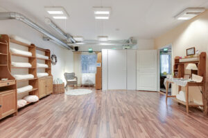 Ryhmätilaan tuolit 13 henkilölle, jooga-alustat, bolsterit ja viltit kahdeksalle. 10 mahtuu hyvin esim. äänimaljarentoutuksiin, jos ei tarvita erityisesti liikkumiseen tilaa.